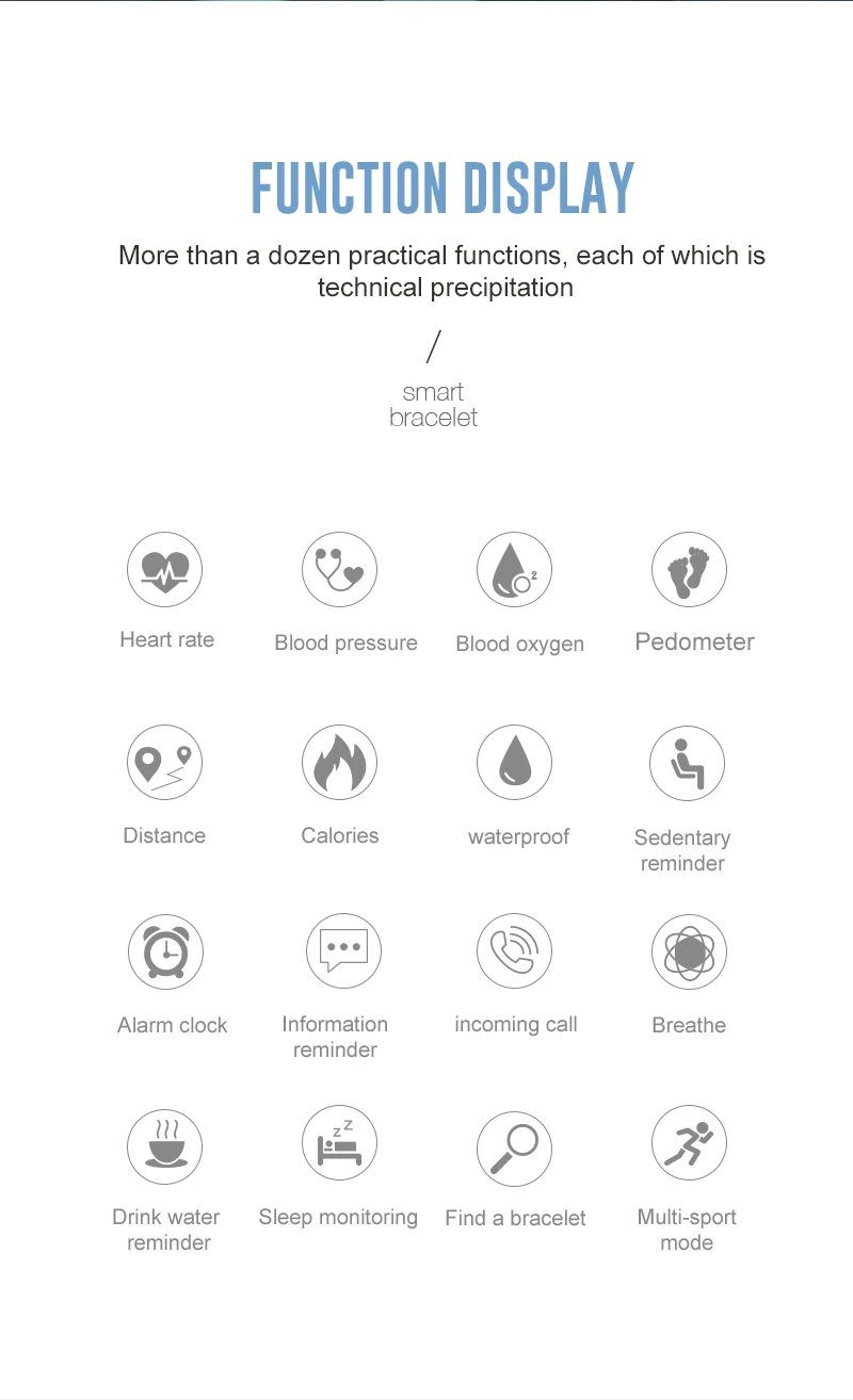 Function: Passometer,fitness tracker,sleep tracker,Message Reminder,Call Reminder,REMOTE CONTROL,Push Message,Alarm Clock,Heart Rate Tracker